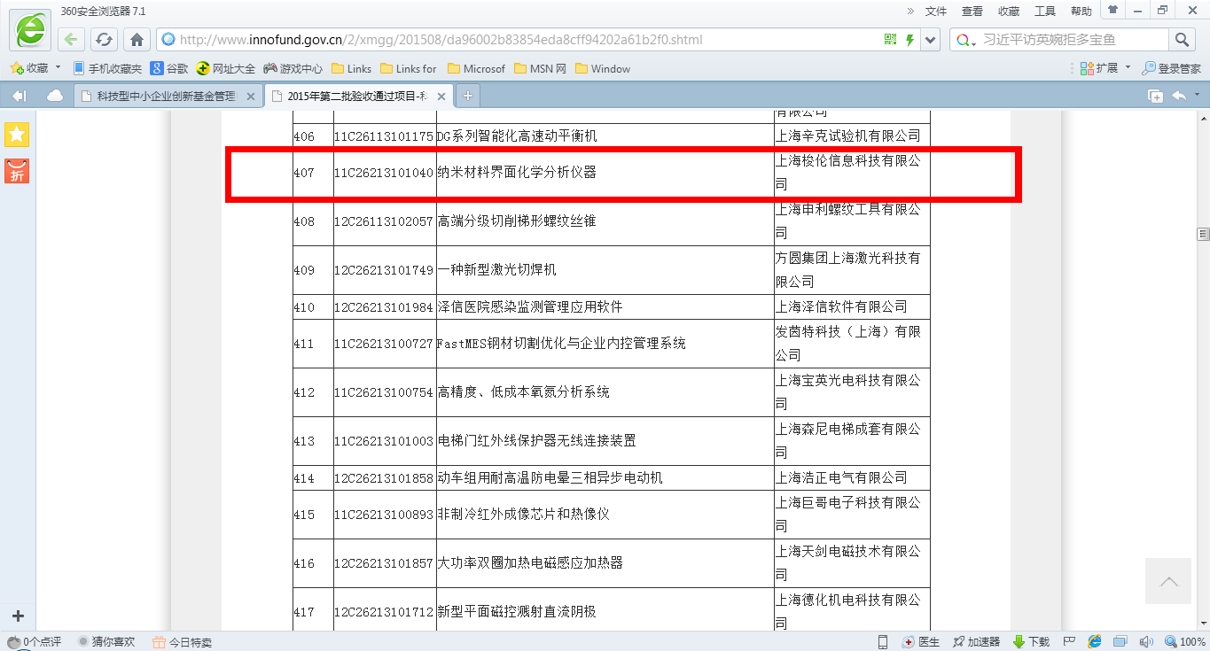 2015年6月,由上海梭伦信息科技有限公司承担项目研制与销售的国家创新基金项目-纳米材料界面化学分析仪器通过国家科技部验收。本项目涉及界面化学分析仪器的各种关键分析仪器及其核心技术。本项目包括了称重原理的表面张力仪,光学原理的接触角测量仪以及旋转滴法界面张力仪。